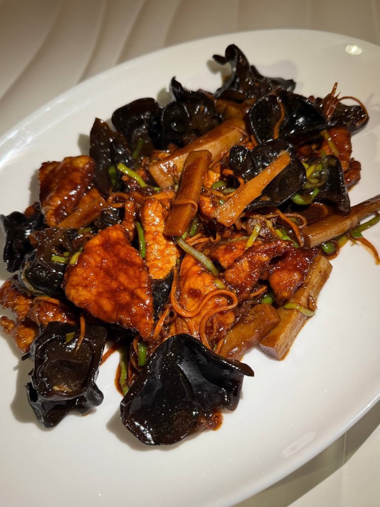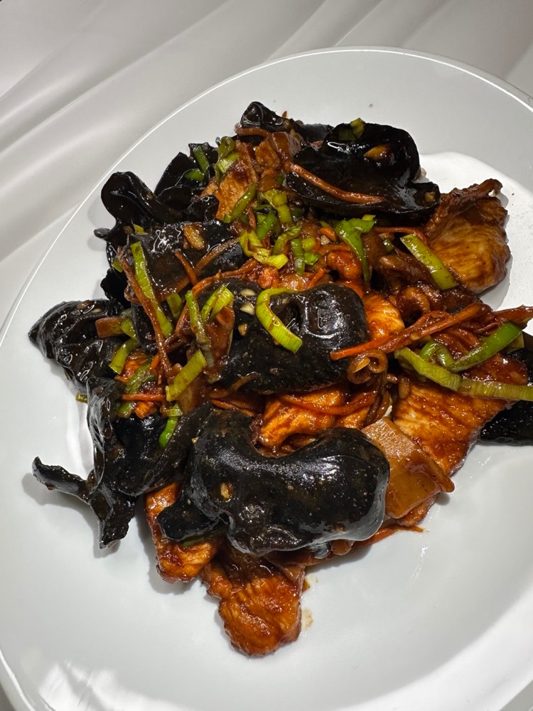 Основні інгрідієнти: свинина, морква, чорні гриби муєр, консервований бамбук