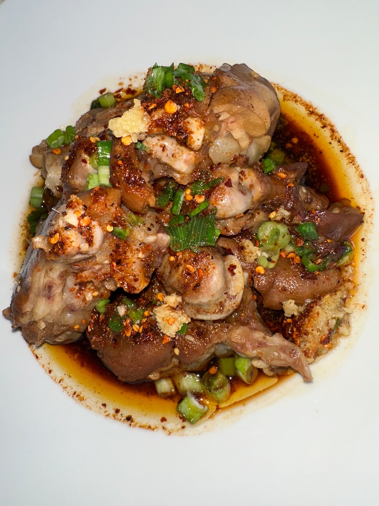 Варені свинячі ніжки, соус з гострими китайськими спеціями, зелена цибуля, часник, імбир