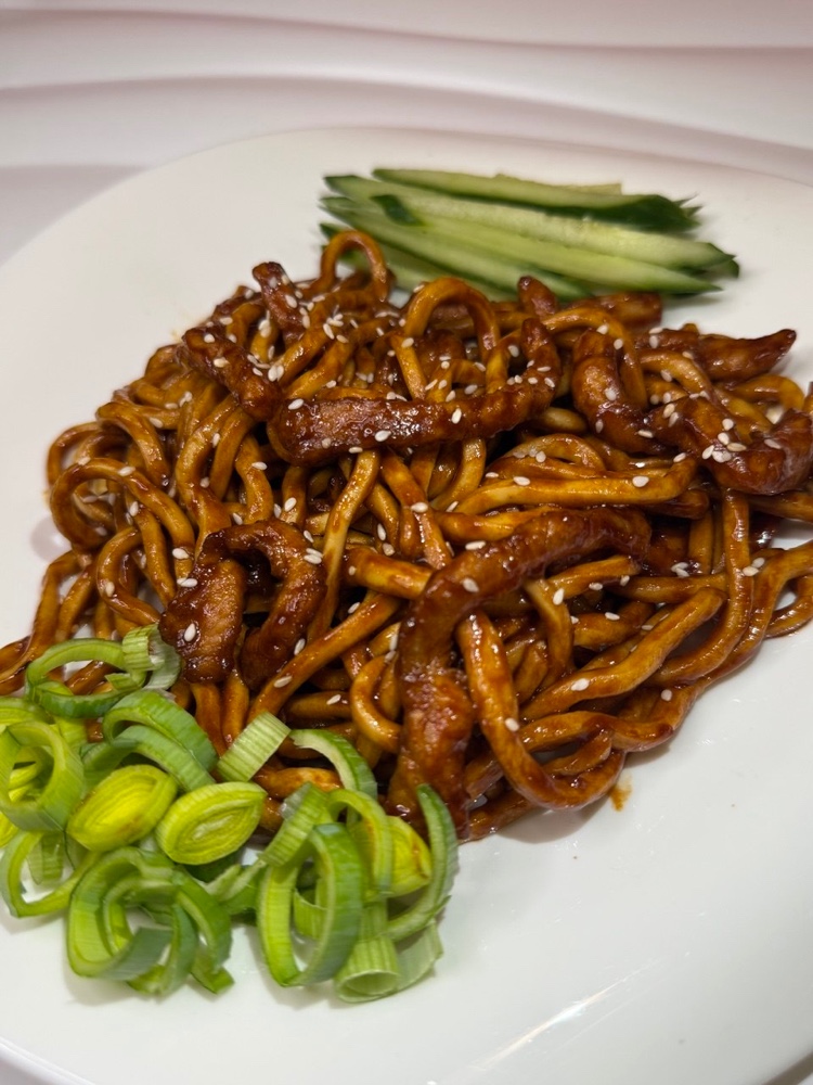 Яєчна локшина, свинина, огірок, порей, Пекінський соус